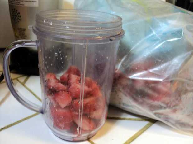 Llenar la licuadora, que también pasa a ser un tamaño de la porción, a mitad de camino con sus trozos de fresa congeladas.