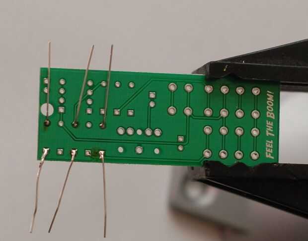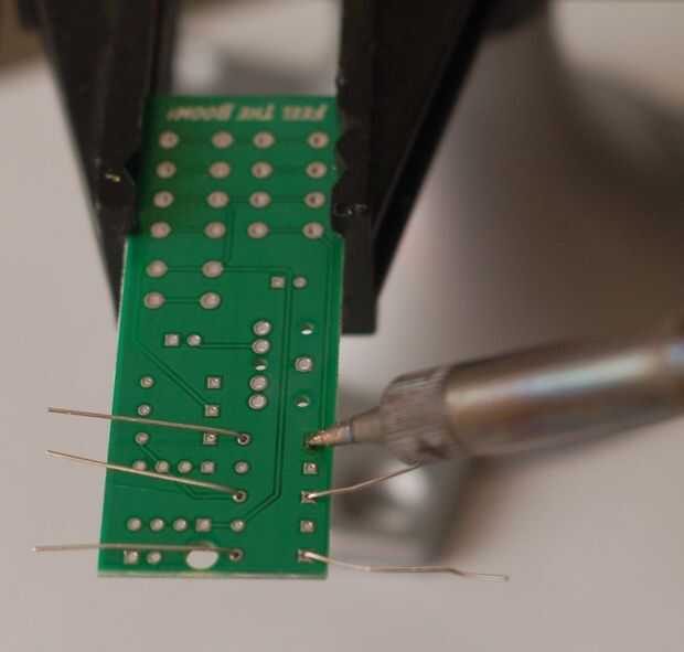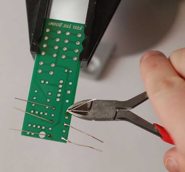 Doblar las puntas, insertar las resistencias, voltee la placa y soldadura hacia abajo. Para finalizarles corte los conductores del exceso con sus diques.