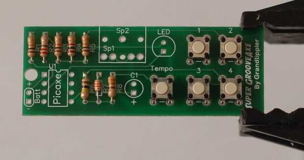 Después, añadir el condensador - entra en la zona marcada C1. El condensador es polarizado, así que asegúrese de que el cable más largo pasa por el agujero cuadrado (uno más cercano al +). El cable más corto (que también está más cercano de la raya pintada a un lado del condensador) pasa por el orificio circular.