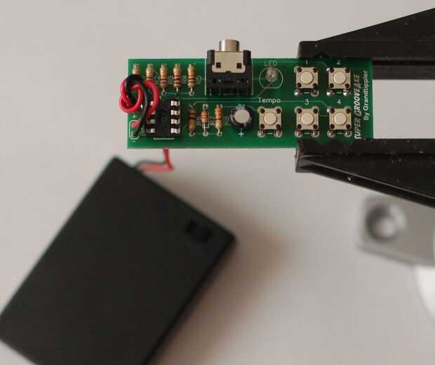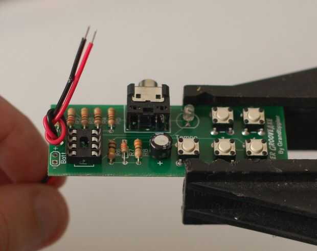 Luego, agregar el paquete de baterías. Tomar los 2 cables desde la caja de batería y de la secuencia a través del agujero en el tablero. Luego, atar los hilos en un nudo. Esto añadirá el alivio de tensión. Por último, soldar el cable rojo en el conector marcado con un +, y el cable negro con el conector marcado con un-.