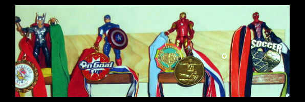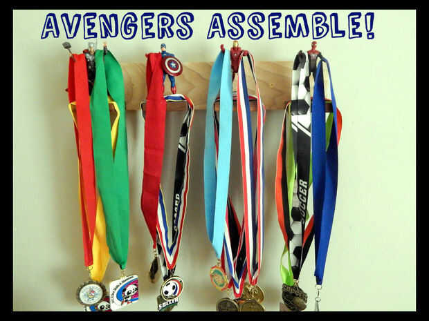 No, no es el sonido de otra batalla de Avengers pero algo el sonido de las decenas de medallas mi hijo tiene colgando de la puerta de su armario. Está cayendo constantemente la llave de la puerta, quedarse atascados en la puerta cuando se cierra y generalmente haciendo un lío y raqueta. También ama a superhéroes. ¿Qué tienen en común superhéroes y medallas? No mucho, pero tal vez los superhéroes se podrían utilizar para lucir sus medallas y organizarlos un poco.