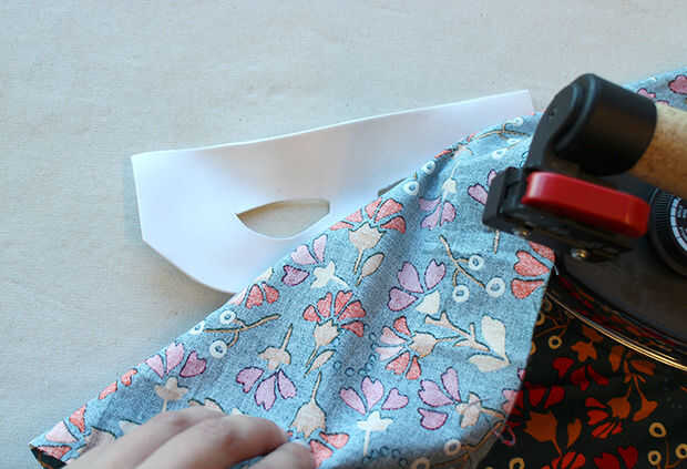 Aplique spray pegamento en el pedazo máscara cortado de la tela de la cubierta y a la espuma mascarilla, cuando pegajoso, suavemente ponga a su tela sobre la máscara, alisando el contorno de ojos y nariz.