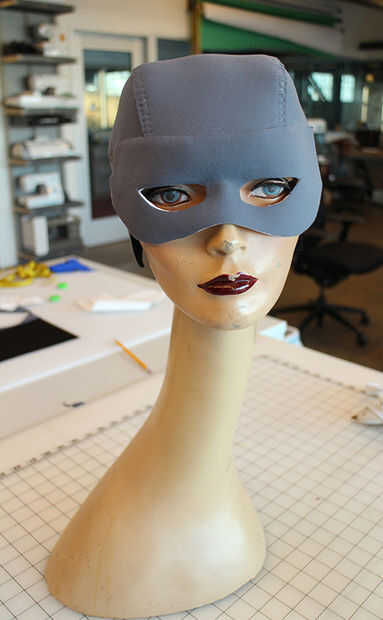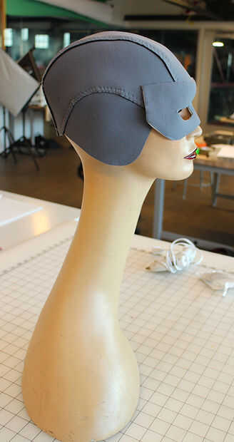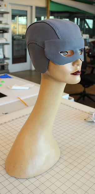 Poner pegamento a lo largo de la la parte superior de la mascarilla y una 1/2" abajo la los lados de las esquinas superiores. Coloque la mascarilla, alineando con las marcas en el casco. Sostenga o peso en el lugar y esperar que se seque.
