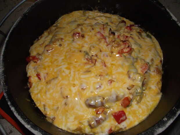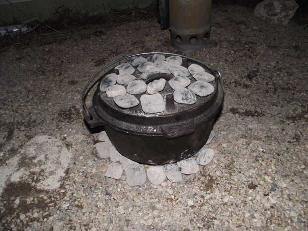 Conseguir la olla encima de una buena cantidad de carbones, luego colocar algunas en la parte superior también. Cocinar durante unos 45 minutos. Una vez que tenemos sólo un paso más (a menos que quiera añadir champiñones).