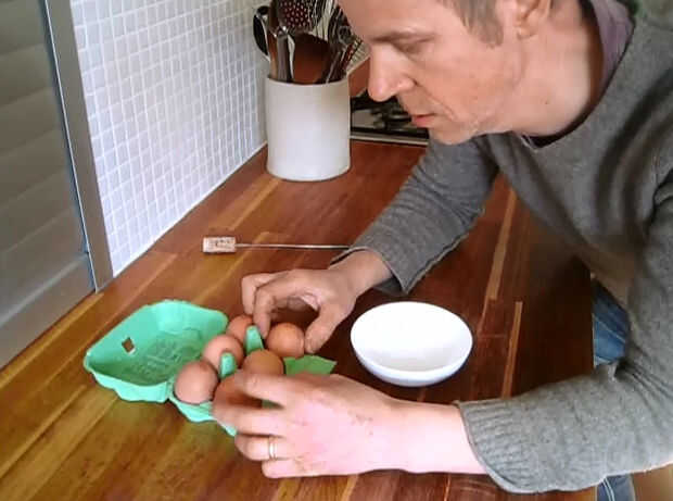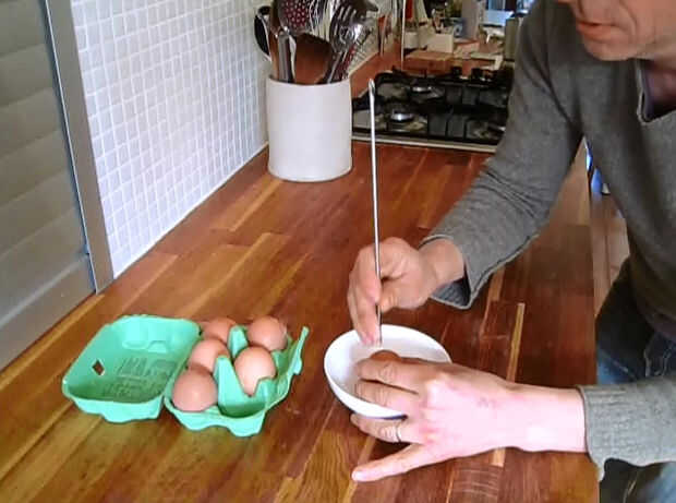 Cuidadosamente usando un cuchillo puntiagudo o una aguja grande que usé, rotura de un pequeño agujero de unos 5mm en el extremo inferior del huevo.