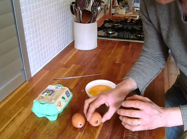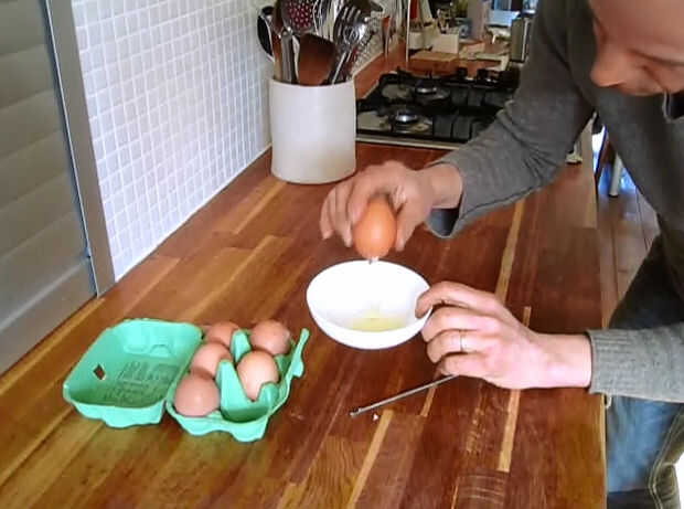 Agite el contenido en un recipiente para usar más tarde para cocinar la cena. Puede ser necesario meter tu cosa puntiagudo dentro para romper el yugo.