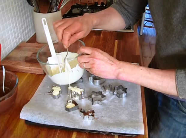 .. .y vierte en la parte superior y utilizar un cuchillo o un palo puntiagudo para mezclar los dos chocolates sobre un poco para hacer un bonito efecto de mármol.