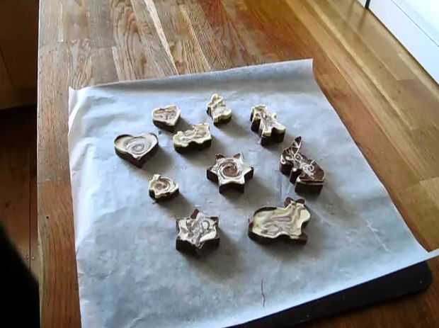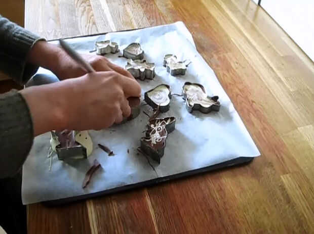 Desde la parte posterior del cortador de galletas con cuidado use un cuchillo para facilitar el lado de la cuchilla del chocolate.