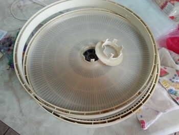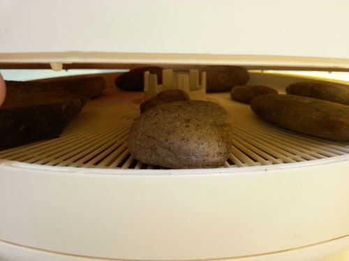 OK, en este punto todo iba bastante bien. Mi deshidratador no quería calentar, así que tomó todo el asunto aparte y limpiado muy bien. Si haces este Asegúrese y configurar tus piezas para que no pierda o se confunda sobre cómo volverlos a montar juntos. Estoy seguro de que sólo había 3 o 4 pernos o tornillos que tenía que desenroscar. Asegúrese de que usted desenchufe la máquina antes de hacer nada. Si usted no está cómodo haciendo sólo tratar de limpiar todo lo mejor que puedas sin sumergir los componentes eléctricos. Si usted recibe los húmedos asegúrese de que se seca apagado muy bien y dejarla sentarse al sol para secarlo. Cuando eso se hace agarrar 2 buenas bandejas y la bandeja modificada. En la parte inferior bandeja pone algunas pequeñas rocas limpias. Asegúrese de que no levante la bandeja por encima de él. Esto ayudará a la deshidratadora para mantener una temperatura más estable. No queremos que las temperaturas a spike o mojar demasiado. Ahora poner en la bandeja 2 º media. Este es sólo el tratar de regular es sin modificar. Ahora que la bandeja modificada y colóquelo en la bandeja 2.