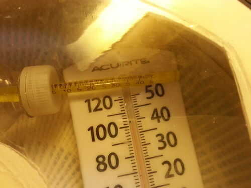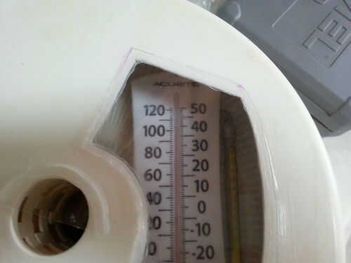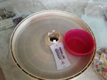 OK, en este punto es necesario colocar un termómetro en la incubadora. También puse un recipiente con agua para asegurarse de que el nivel de humedad es aceptable. Trate de iniciar su calor en un nivel medio y dejarlo durante una hora. luego volver y comprobar para ver lo que es. La temperatura debe ser alrededor de 99.5 grados F y 37,5 grados centígrados. He comprado este termómetro en Walmart por 2 dólares. Mi padre tenía un termómetro C super preciso que empujó a una botella de agua llena de agua. Esto hace las 2 cosas. Me da otro termómetro para que puedo utilizar el promedio entre las 2 y me da una lectura de temperatura interna. Ya que yo no puedo meter un termómetro en los huevos, esto imita un huevo y me dice qué temperatura sería en uno.