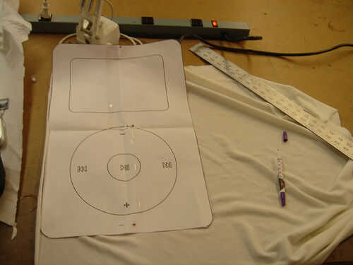 Marque el lugar donde se instale la ventana y el marcado con la plantilla del IPod Super que utilizamos para cortar a la tela en el primer paso. Coloque los pedazos de tela gris en la cubierta de la almohadilla con pegamento para tela. Luego conecte las señales que ya cortes en el tejido del dial.
