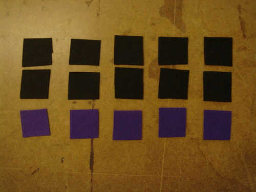 El en primer lugar, usted necesita cortar diez pedazos cuadrados de fieltro negro y 5 pedazos cuadrados de fieltro morado que son 3 "x 3". Adjunto un trozo de tela conductora en medio de la tela con pegamento para tela. Deja poco margen de bit cuando se coloque la tela.