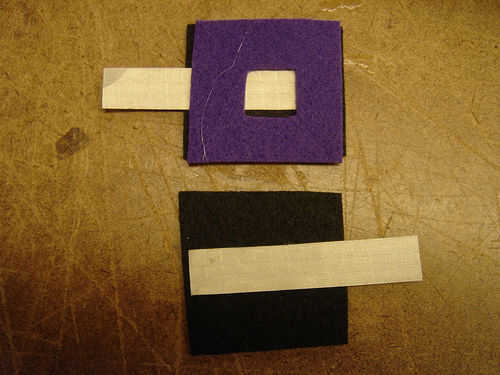Pegue un pedazo de fieltro negro y fíjela con tela conductora a un pedazo de fieltro morado. Luego, coloque otro pedazo de fieltro negro (que tiene un lado opuesto del ala tela conductora) al otro lado de la púrpura se sentía.
