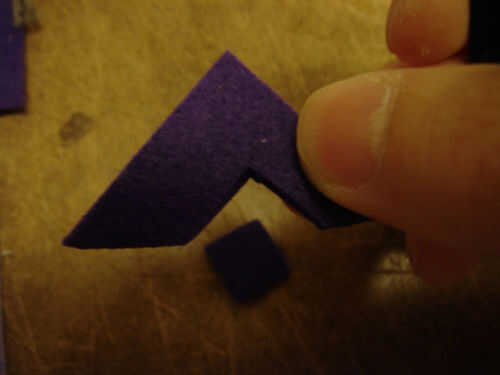 Doble un pedazo de fieltro morado diagonalmente. Corte la parte media de la pieza para hacer un orificio que es 1/4 pulgadas x 1/4 pulgadas