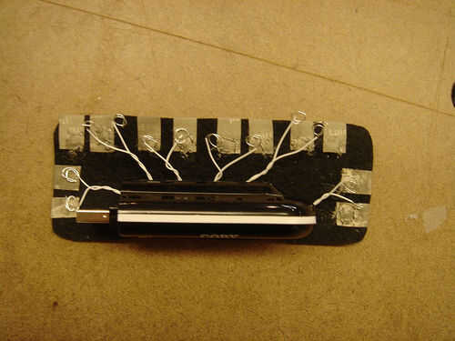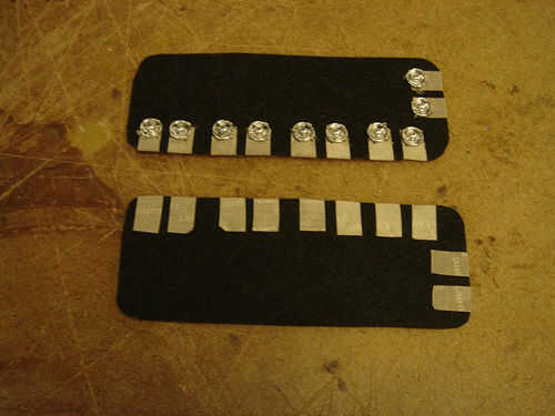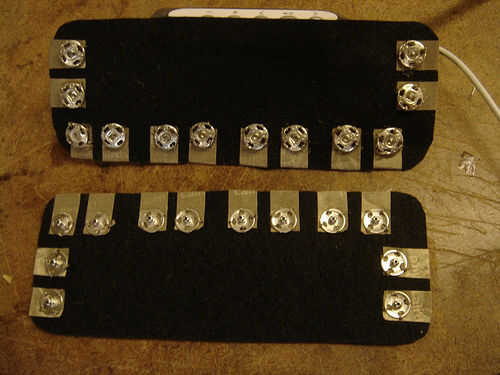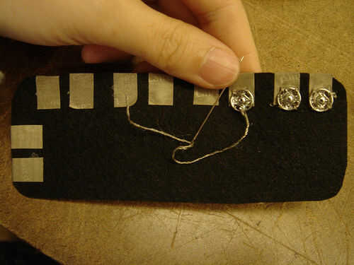 1. preparar dos pedazos de fieltro negro (5 pulgadas x 3 pulgadas). Sobre un fieltro negro, conecte 12 pequeños cuadrados de cinta conductora de la tela y coser los 12 broches unilaterales en la cinta con hilo conductor.