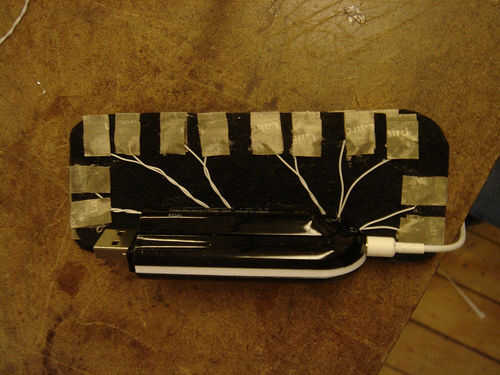 3. en el otro lado de fieltro negro, pegar el reproductor de mp3 hackeadas. Retuerza los extremos de los cables y coserlas para conectar al otro lado de los broches de presión con el hilo conductor.