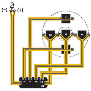 Tienes unos cables de fieltro hecho a mano. Si usted compra el kit, puede encontrar en el kit. Si quiere hacer usted mismo, compruebe el "How to make tejido los cables". Es muy fácil de hacer con la tela conductora y fieltro. Con estos cables fieltros, conecte los broches de presión a los interruptores. Corte un poco en medio de un lado de los cables de fieltro. Coser el borde dividido a cada ala de tela conductora del interruptor. Coser el otro lado de los cables a los broches de presión en la base de reproductor de mp3.