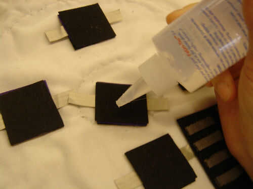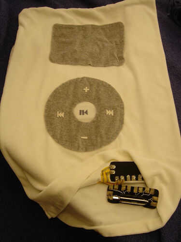 Ahora tienes cinco interruptores de tela suave. Marque la posición del interruptor usando la plantilla de IPod. Establecer la posición del interruptor de la esfera dentro de la almohada y pegue el interruptor usando el pegamento de tela. Ahora toma el reproductor de mp3 base, que tiene 12 broches y fíjelo a la parte inferior utilizando el pegamento para tela.