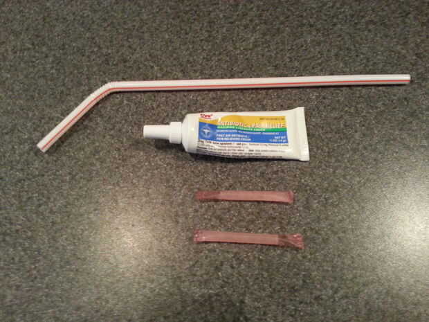 Después de que esteriliza la herida, usted querrá aplicar un antibiótico. Desafortunadamente, el tubo no puede caber dentro de su nave y paquetes individuales son ridículamente caros. Puede cortar aparte una pajita (uno que robó de Chik-Fil-A) y exprimir algunas de tu propio ungüento antibacteriano en él, selle los extremos con cualquier cinta o por fusión con un encendedor y alicates de punta delgada y luego añadirlos a tu equipo.