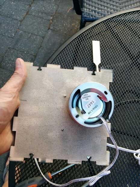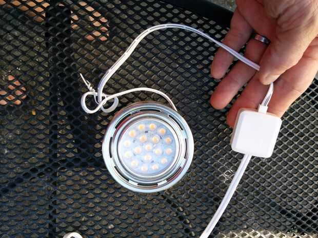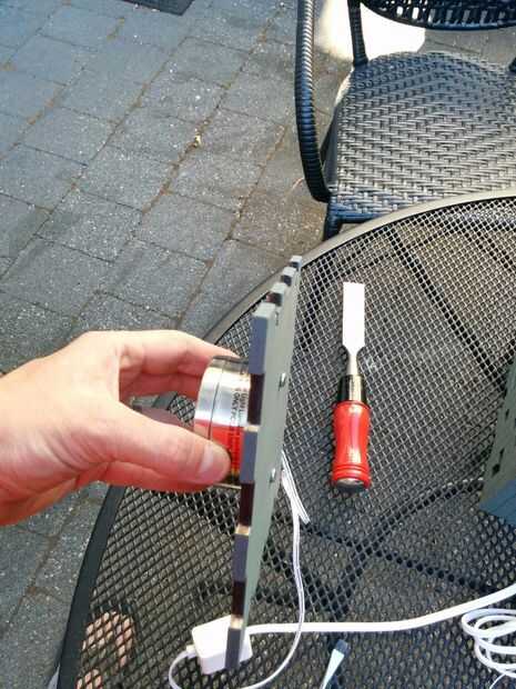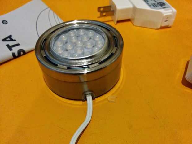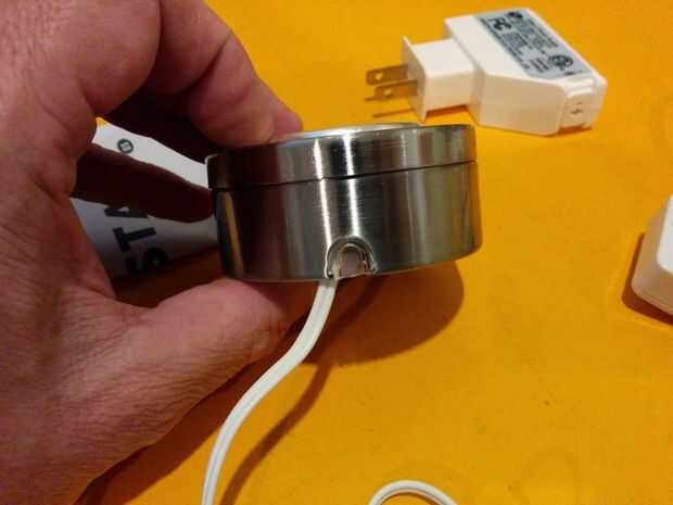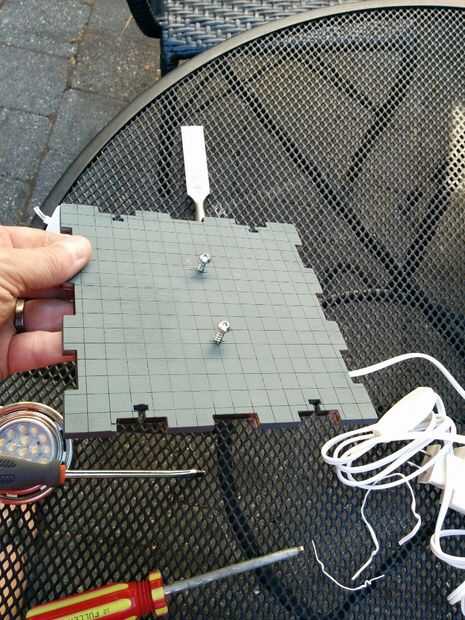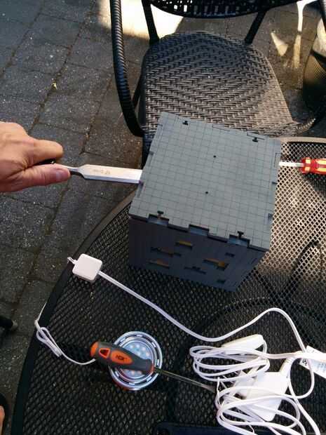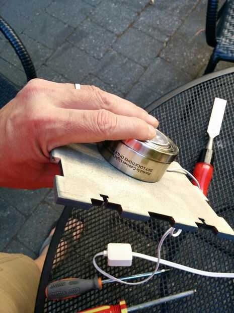 Ahora que el cuadro está montado y pintado, es tiempo de la luz a la placa inferior del tornillo. Retire la placa inferior. Usé un cincel en la imagen. Tornillo del #8 3/4" tornillos para madera en los agujeros existentes en la placa inferior. Los agujeros son un poco pequeños, así que suave. Atorníllelos en hasta que la toques de punta a través de. Línea de la luz y seguir poniendo en los tornillos. Los agujeros se coinciden perfectamente con los orificios de montaje de la luz de puck de Ikea. El sistema de alimentación es un poco extraño. Sólo intento mantener lo extraño poder bloque dentro de la caja.