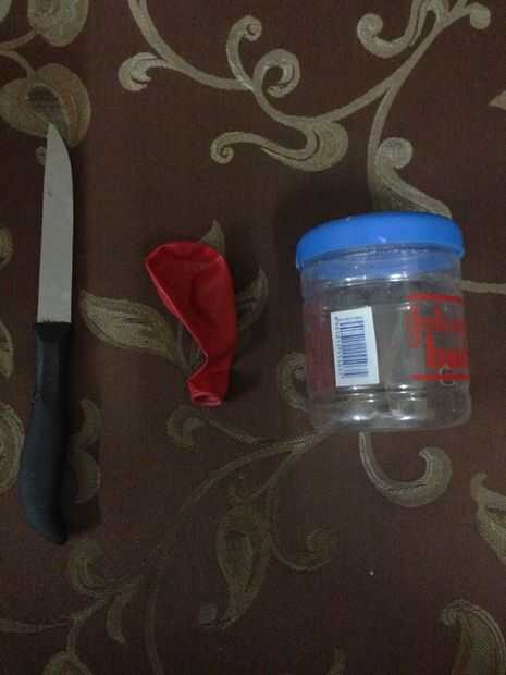 Necesita: caja del 1 cilindro, puede ser un palillo de dientes o una caja de la almohadilla. 1 balón 1 cortador o cuchillo 1 goma