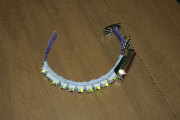 He desmontado un collar comprado y transformado en un poco diferente. : )materiales:collar de perro barato (para piezas)velcro (cualquier color o ancho, por lo menos 2 pies de ella)LED (yo usé 11)batería (usado celular de moneda con el sostenedor, 3v