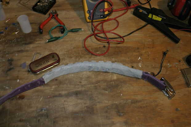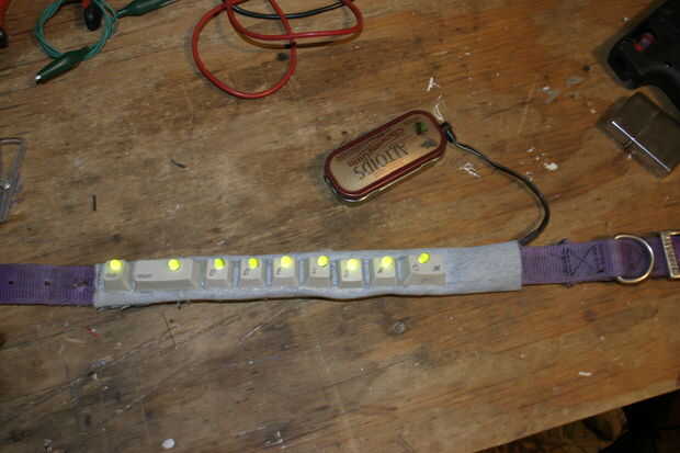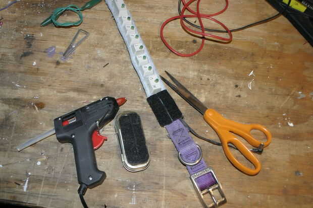 He desmontado un collar comprado y transformado en un poco diferente. : )materiales:collar de perro barato (para piezas)velcro (cualquier color o ancho, por lo menos 2 pies de ella)LED (yo usé 11)batería (usado celular de moneda con el sostenedor, 3v
