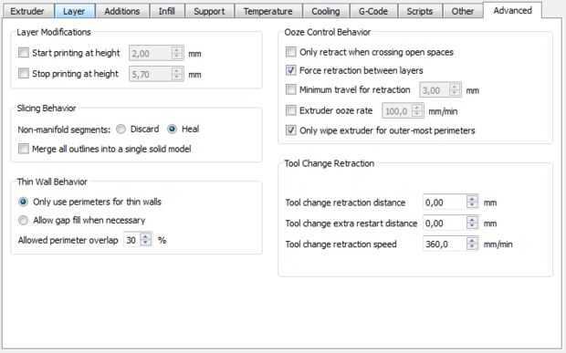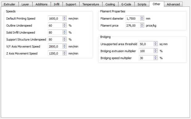 Para un cuerpo más robusto te recomiendo 100% relleno y 2 conchas. Para el clip de la batería puede utilizar misma configuración excepto anchura de extrusión que puse a 0,42 para conseguir un mejor ajuste en el cuerpo. Para la adherencia de la cama he utilizado cinta de pintor regular.