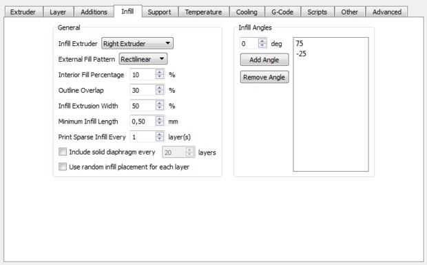 - Relleno: 10% con 50% ancho de extrusión a 75 y -25 grados