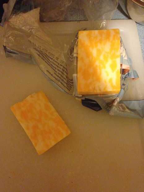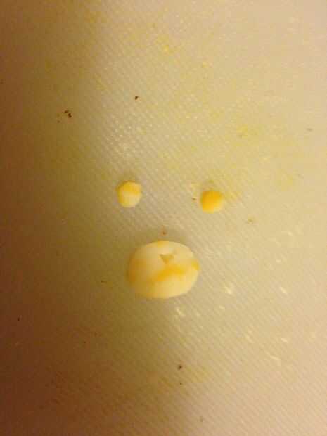 Tomar el queso y tallar hacia fuera tres pedacitos redondos, dos más pequeños para los ojos y uno más grande para la boca. luego tallan la nariz fuera de la pieza más grande y listo. Sujete a la cara del oso con palillos de dientes así que el no caerse.