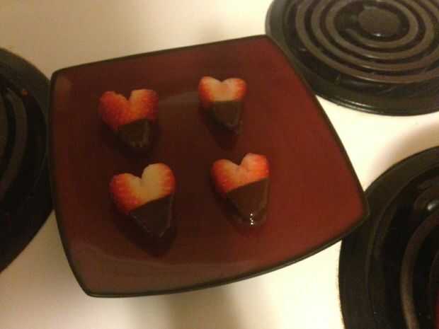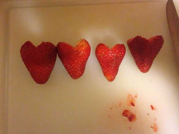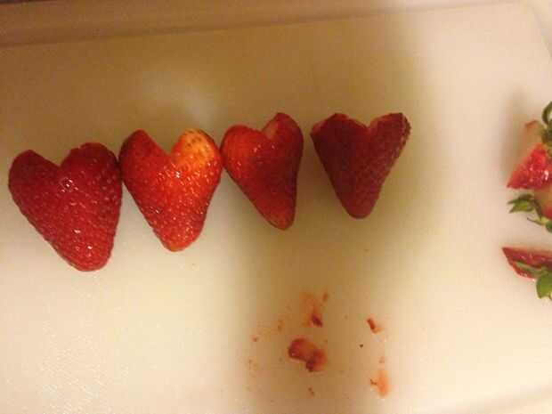 Para dar las fresas en forma de su corazón, usted tendrá que empezar por el corte de la espiga de corte hacia abajo en un ángulo a los dos lados de la misma y quitando un pedazo de v-como, junto con las hojas de la baya. Después de usted necesita redondear la parte superior de la baya cerca de donde la madre solía ser para darle esa forma de corazón. Entonces, usted simplemente corte un poco fuera de la parte delantera y trasera de cada una de las bayas para que mienten planos. Ahora están listos para la inmersión.