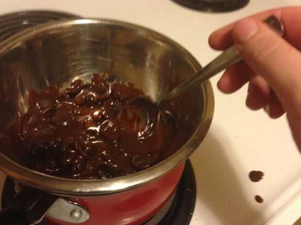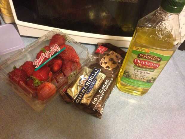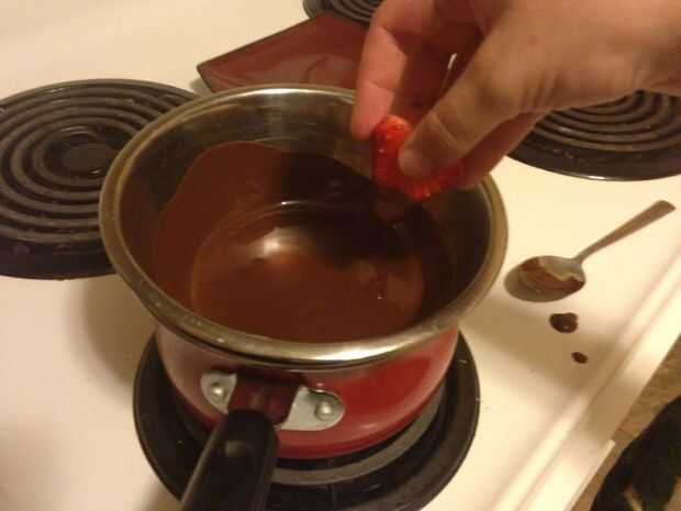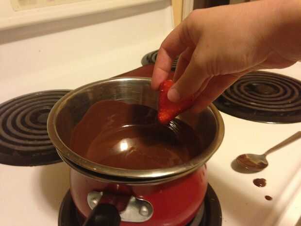 Si tienes una caldera doble, esta es la parte donde tirar hacia fuera. Si, como yo, no tienes uno, simplemente llene una sartén la mitad con agua y poner una taza de metal que no caen en la bandeja en la parte superior. calentar la sartén/caldera en medio poner el chocolate y el aceite en el revuelo del recipiente de la caldera hasta que el chocolate se haya derretido a través y luego sumergir las fresas en él.