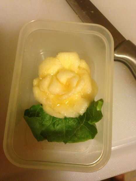 Una vez que haya terminado, coloque la manzana en el recipiente previsto para él. He añadido un pequeño poco de lechuga para que se vea como la flor fue creciendo hojas que hizo mucho más bonita. :)