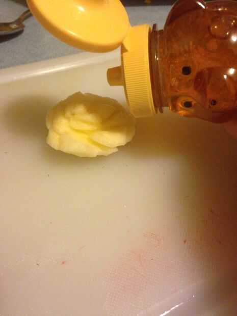 Una vez hecha la forma de la flor, añadir miel a todos de las grietas que se corta. Esto le da la manzana un sombreado más oscuro en esas zonas que ayuda a que se parecen más a una flor y también absorbe el sabor de la miel en la manzana y sabor delicioso.