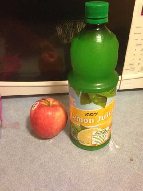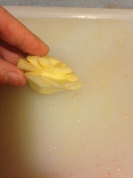 En este punto había empapado en agua de limón un poco. He mezclado el jugo de limón y el agua en un recipiente y dejó la manzana en remojo durante aproximadamente medio minuto. Sabor limón jugo evita la manzana da vuelta marrón como le da la manzana un sabor de limón ligera en el exterior que lo hace.