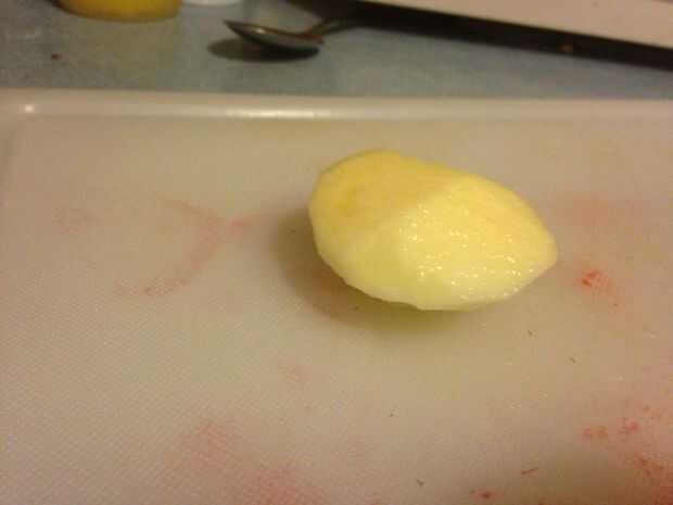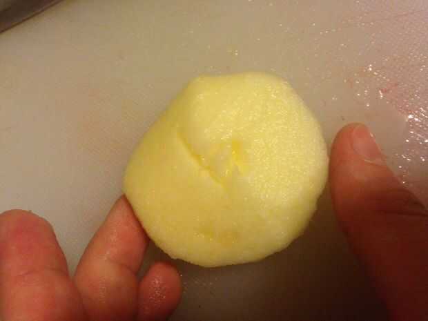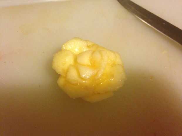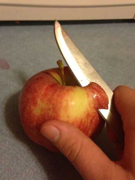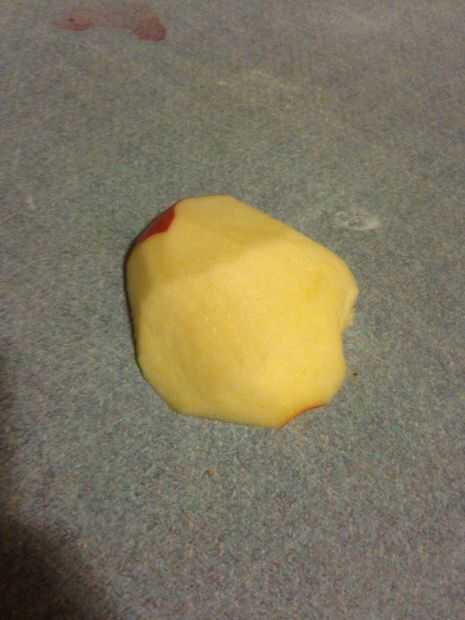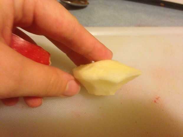 Así que, después de pelarlo, corte un trozo del lado justo lo suficientemente lejos del centro que no consigo las semillas con. luego doblé el pedazo. Después puso en una tabla de cortar y corta en un ángulo hacia el tablero de corte para que la parte superior de la porción de apple era más grande que la parte en la Junta.