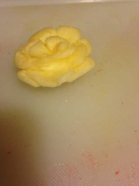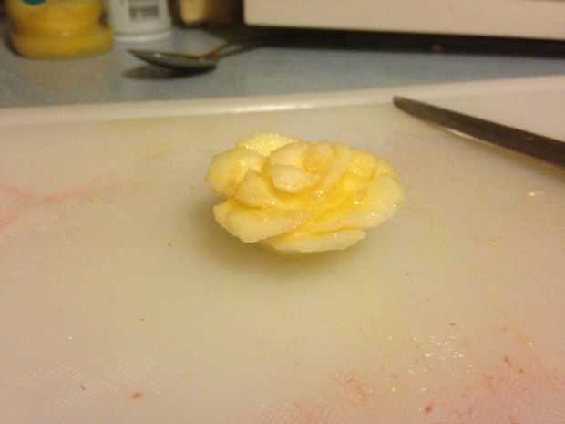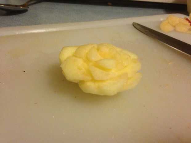 Tome la manzana en el jugo de limón y cortar una pequeña ranura en el medio. Corte ranuras más hacia el más grande como usted consigue más lejos del centro y cerca de la orilla. Una vez haya realizado todos los cortes que es necesario profundizarlas. No tienes que profundizar los recortes si su preocupación acerca de lastimar a su creación. Mi flor parecía bien antes de que hice los pétalos más obvios y unos pétalos cayeron durante mi pétalo de profundización que provocó que van desde como una rosa, a mirar como una flor genérica, pero me gustó mucho cómo se cuando he pagado un poco más atención a la forma los pétalos estaban tomando.