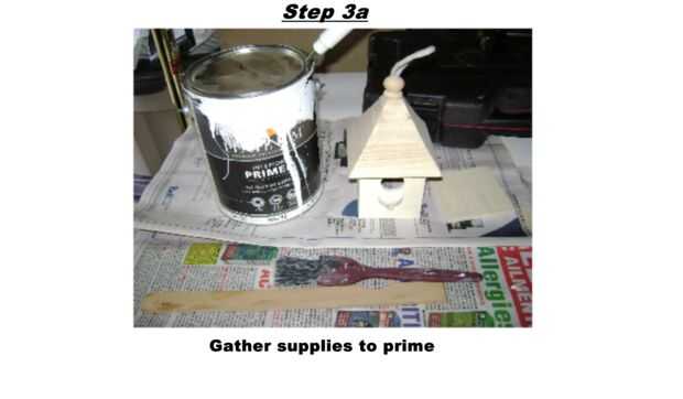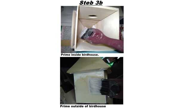 Usar imprimación de pintura para cubrir todas las superficies de madera. Empezar por la pintura dentro de la pajarera. Cebe el exterior. Mano girar un tornillo en medio base para usar como mango. De esta forma que ambos lados pueden ser preparados a la vez. Colgar la pajarera y la base se seque durante 24 horas.
