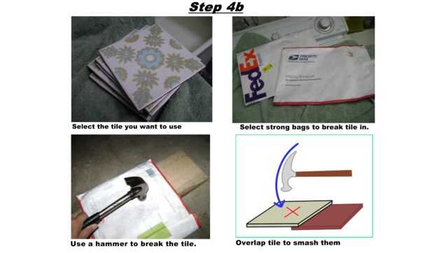 Superposición de azulejos para que el borde se asienta sobre otro azulejo en un ángulo y golpeó con un martillo. Ya ha Halloween bajo el ángulo de la baldosa se romper en pedazos. Rebreak cualquier pieza que es más grande que 1 pulgada cuadrada.