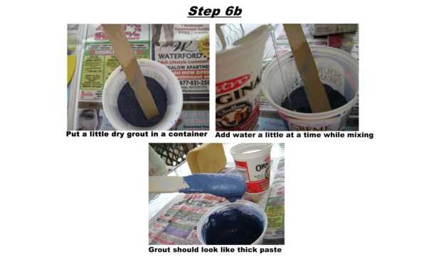 Pequeños lotes son mejores que dejarlo en seco y derroche. Recordar... un poco va una l ong forma. No es necesario medir sin embargo usted debe seguir las recomendaciones del fabricante para que la lechada que tenga más lechadas. .Agregar agua un poco a la vez para no añadir demasiado. Mezclar después de cada adición. La lechada debe tener apariencia gruesa pasta y no se debe ejecutar.
