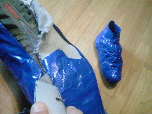 Una vez que tenga la forma de la cáscara hecha puede empezar a recortar con cuidado las partes del calcetín. Aviso que yo he doblado sobre la cinta en la parte izquierda del cuadro. Este corte va hasta justo al otro lado de la Cala. Si haces esta parte, usted debe también ser quitar la parte de sanación del calcetín y otras partes del calcetín que se encuentran en el camino.