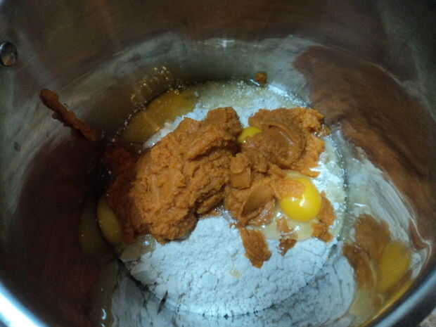 Para empezar la mezcla, añadir los huevos y la lata entera de calabaza y mezcle bien con los ingredientes secos. La calabaza está húmeda, por lo que tal vez prefiera a menos que la cantidad de otros ingredientes húmedos. Había agregado de la leche y el aceite, lentamente, para asegurarse de que el bateador no se demasiado húmedo pero terminó siendo bien. Mezclar bien durante unos minutos para asegurarse de que no queden grumos.