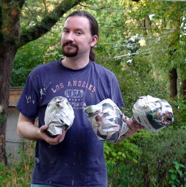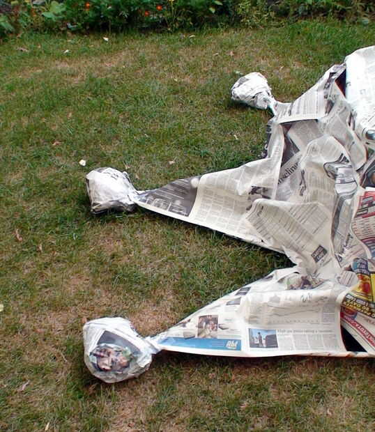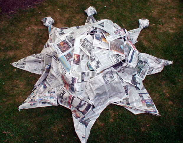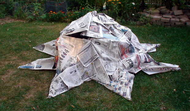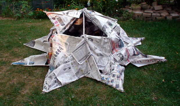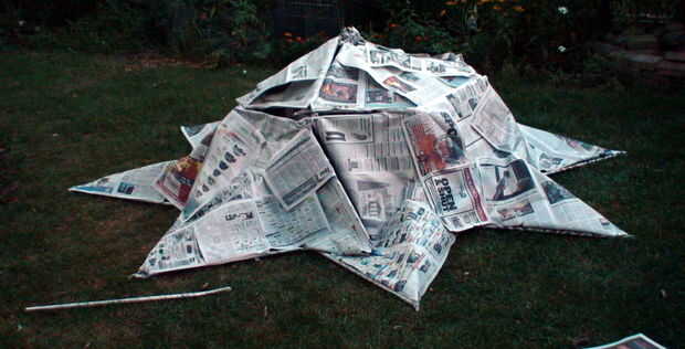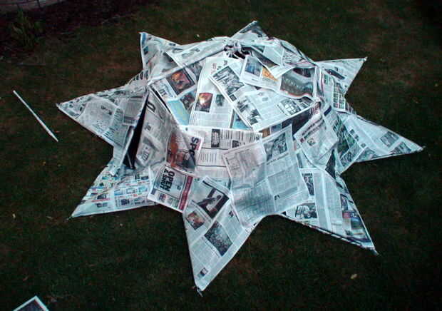 Esto es otra vez como antes. He intentado asegurar la piel mejor al marco para agregar fuerza. No podría pensar, sino que muchas páginas de periódico tiene una cantidad decente de peso. La estructura sin duda notado porque la cúpula central empezaron a hundirse realmente. Para intentar evitar el desastre encontré un trozo de rama de árbol en el patio y utilizado como un poste central para levantar la cúpula.