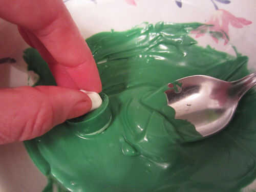 Tomar 1/4 de taza de candy melts y microondas por 20 segundos, remover y repetir hasta que el caramelo se derrita completamente. Inmersión en una seta y sacuda el exceso caramelo.