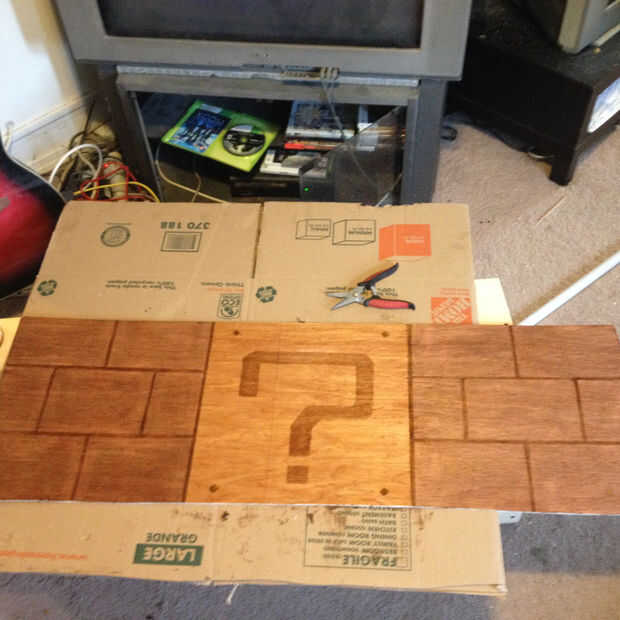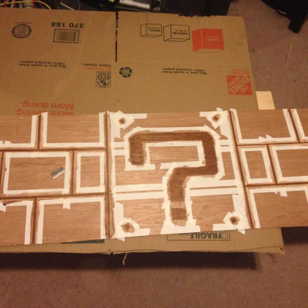 -Una vez que las líneas se quitan y retoque, aplique una capa delgada agradable de la castaña, si dio tiempo para secar las líneas negras, usted puede ir sobre las líneas de ladrillo y la segunda capa de mancha debe hacerlas más oscuro. También usé este color para llenar en el signo de interrogación.