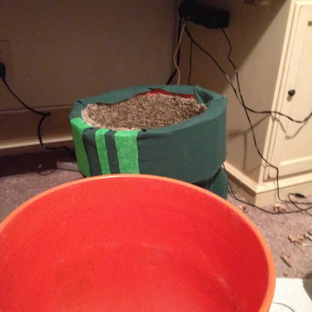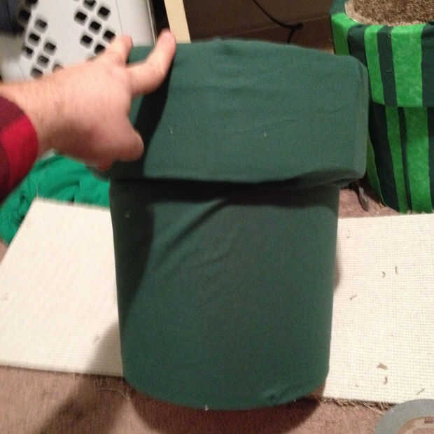 Tomar su oscuro paño verde y envolver su cubo en el mismo. Su mejor a lo grapa cómodamente y todo el camino alrededor de la parte inferior primero. trabajar alrededor de marcha el cubo. Recuerde, enfrentaremos a 1 lado del cubo de la pared, así que prueba y que usar como la parte donde pones tus las grapas.