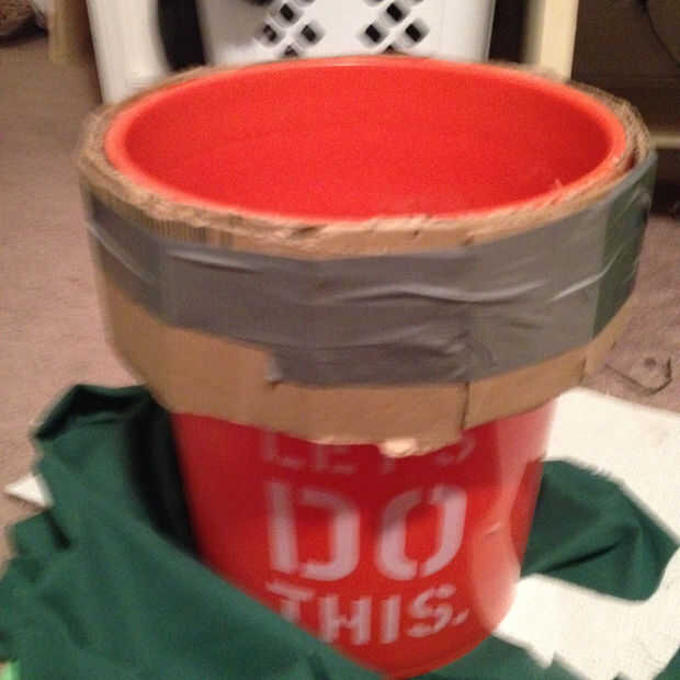 Tomar la manija del metal de la cubeta y retírela. (Usted puede hacer esto por corte o empujando muy duro y en él) Corte tiras de cartulina de 4 de grueso y largo como sea posible. El cartón de la grapa en las partes carnosas de la cubeta y envolver el cartón alrededor de 3/4 rotaciones completas para obtener el espesor deseado. Al hacer esto, la parte superior debe quedar al ras con la parte superior del cubo, pero la parte inferior debe cerca de 1 en ya entonces la parte carnosa superior del cubo.