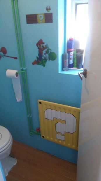 un radiador antiguo fue tomado de un salto y fue pintado en pintura a prueba de herrumbre varias veces antes de ser pintado como cerca de la original Mario colores como he podido conseguir. la pintura que utilicé fue ollas de probador de emulsión a base de agua y muchas capas de barniz una vez yo estaba feliz con él. los círculos en las esquinas demostraron para ser los más difíciles de pintar como radiadores no son planos, llegué a este por trazado alrededor de monedas.