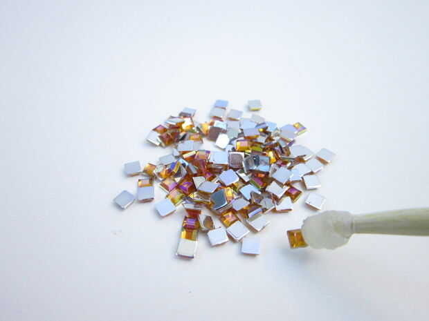 También puede utilizar cera de vela en lugar de pegamento caliente, probé esta versión también que trabajó bien pero el residuo de cera izquierda en los rhinestones que tuve que limpiar luego.