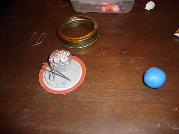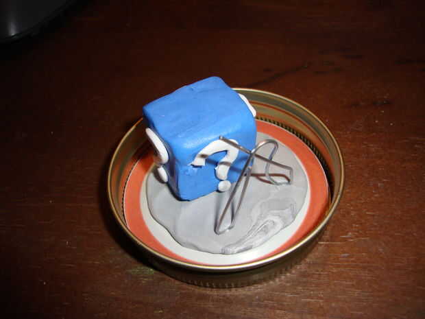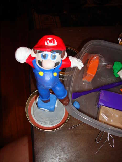 Mi hermano quería que este configurado en el calabozo, usé el azul? caja que se encuentran en algunos niveles.  Para hacer la caja de hacer un papel cuadrado y cubierto con arcilla.  Mezclado blanco y azul para obtener a este precioso azul.  ¿El? era un lugar en la caja y bobina blanco desplegado.  ¿Tomé un clip roto y lo condujeron en la? caja, pata de Mario fue en la otra mitad del clip.  Por lo que podía trabajar sobre huesos secos, pongo su otro pie en un contenedor por lo que pude mantenerlo equilibrado.